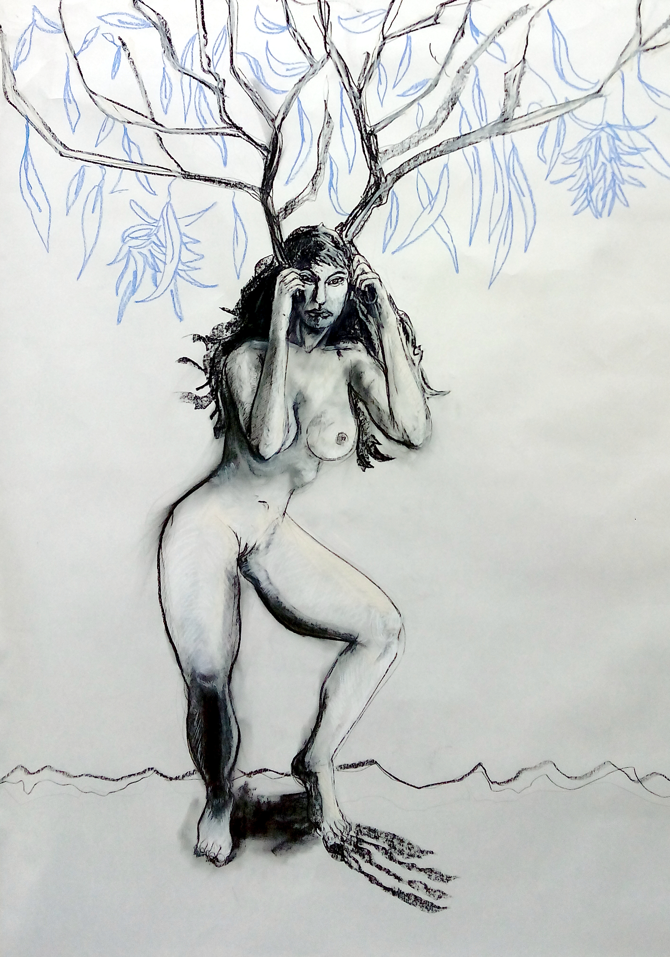 La série que j’ai appelée « les sorcières » m’est venue en deux temps. J’ai d’abord réalisé les collages un peu abstraits à partir de catalogues de papier-peint que j’avais récupérés. J’ai voulu figurer des incendies, ceux qui parcourent aujourd’hui les forêts des États-Unis ou bien de la forêt amazonienne. Je pense que tout le monde s’est aperçu du caractère terriblement plastique de telles catastrophes, ce ciel rouge comme du sang, ces horizons piqués de brasiers qui font comme des fleurs impressionnistes, ces terres brûlées hachées par des troncs d’arbre calcinés comme des traits de crayon dans un dessin au charbon. Mais ce que je réalisais ne me paraissaient pas à la hauteur de ce qui arrive. Quelque chose manquait. Et m’est venue l’image que ça n’était pas que des arbres qui brûlaient, mais aussi un certain esprit. Des processus naturels perdus, le sol même sur lequel reposent les sociétés humaines depuis des millénaires qui disparaît. Ces images d’incendies m’ont paru comme le témoignage d’un saccage, d’une sorte d’holocauste sans victime humaine directe, mais consumant l’esprit des forets, des floraisons et des cycles naturels des saisons. Il m’est alors apparu que je devais dessiner des nymphes dérangées par le regard du spectateur, celui qui contemple sans comprendre. Des sorcières chassées du cœur des forêts qui ne peuvent plus accomplir les rites de passage des saisons, qui ne peuvent plus se tendre les offrandes d’étranges fleurs bleues comme la nuit nécessaire à la perpétuation de la vie. Dessiner ces grandes figures féminines m’a soulagé, car j’ai eu l’impression de pouvoir extérioriser ce qui me dérangeait le plus dans le spectacle de ces incendies, exprimer une peine si forte qu’elle ne trouve pas vraiment les mots à sa mesure.